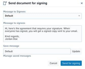 Pro tip: You can save signing messages and reuse them each time you send the same type of document for signing. After filling out your message, simply enter a name for the message and click the grey Save button. Your saved messages are found in the Message to signees drop-down menu in the signing message dialogue.