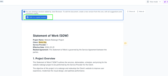 Note: To allow members to finalize drafts before requesting publishing, they are able to accept or deny suggestions in draft documents. Apart from this, user roles and access policies apply when working with draft versions. For example, members are not able to free-text edit documents.