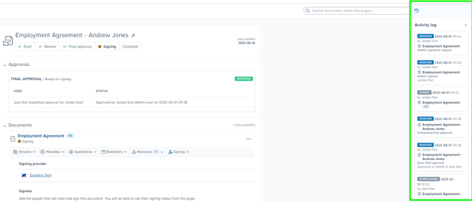 Admin users can track all actions taken, including approval and signing actions, by viewing the Activity log within a project.