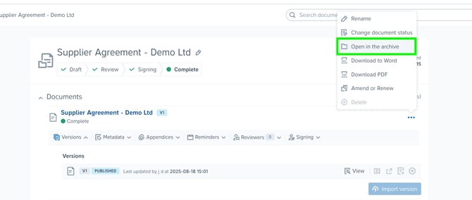 Open the document in the archive by selecting the options menu (...) and clicking Open in the archive. Learn how to manage documents in the Archive.