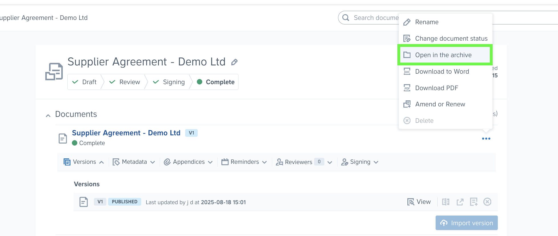 Open the document in the archive by selecting the options menu (...) and clicking Open in the archive. Learn how to manage documents in the Archive.