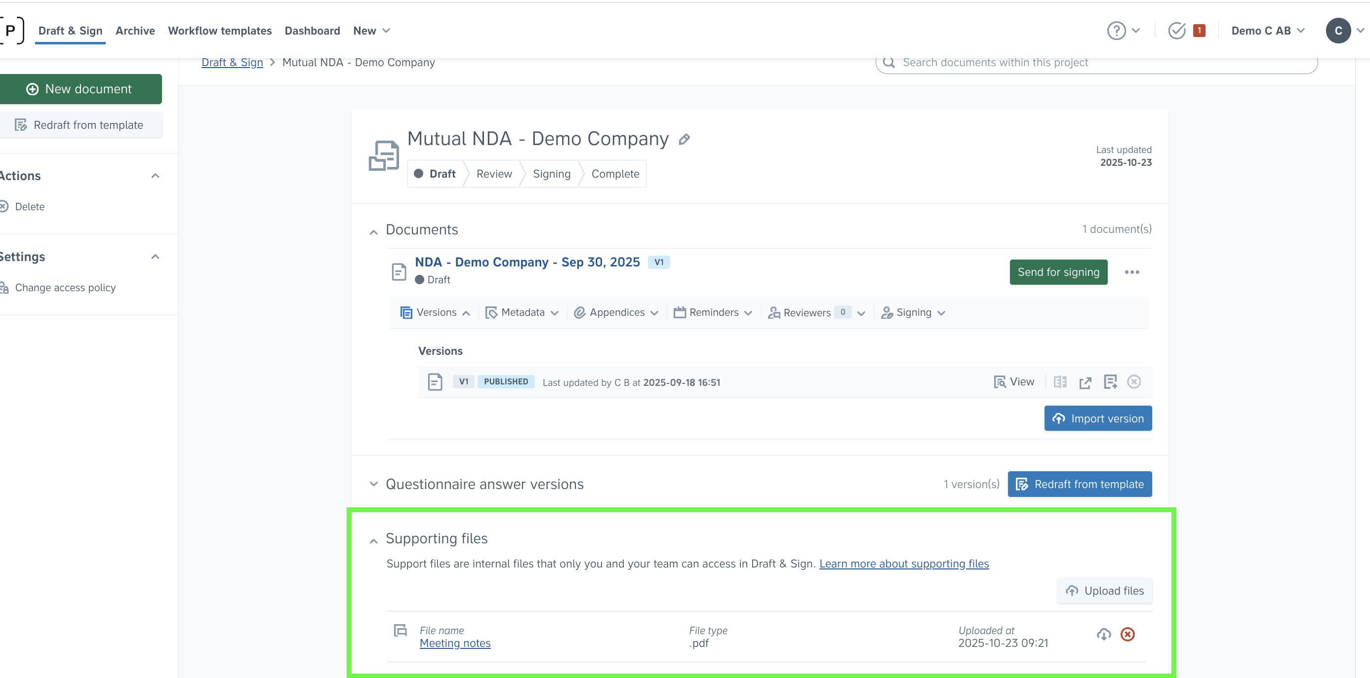 Supporting Files are internal files and are only accessible by teams who have access to the project in Draft & Sign.